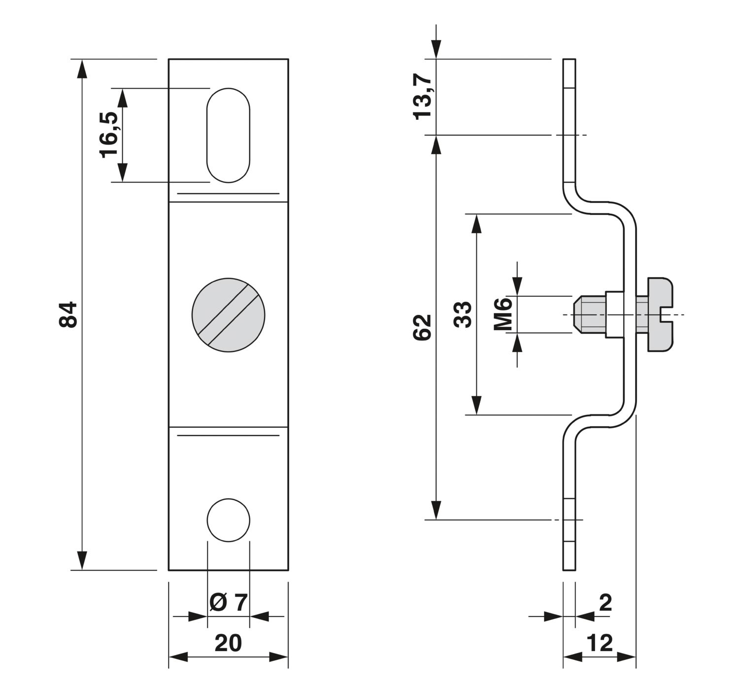 Arco plano, com parafuso M6, para fixação de trilhos de fixação a uma distância de 12 mm sobre o calço