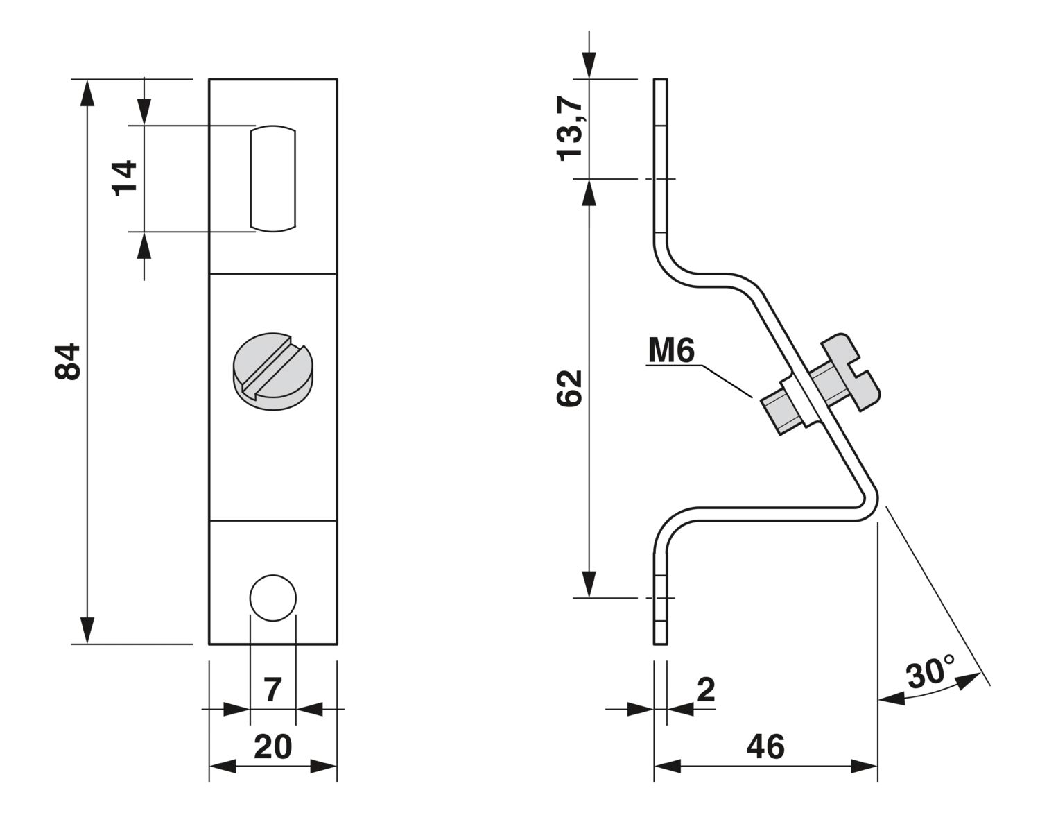 Arco diagonal com parafuso M6, para fixação dos trilhos de fixação em ângulo de inclinação de 30°, altura: 46 mm