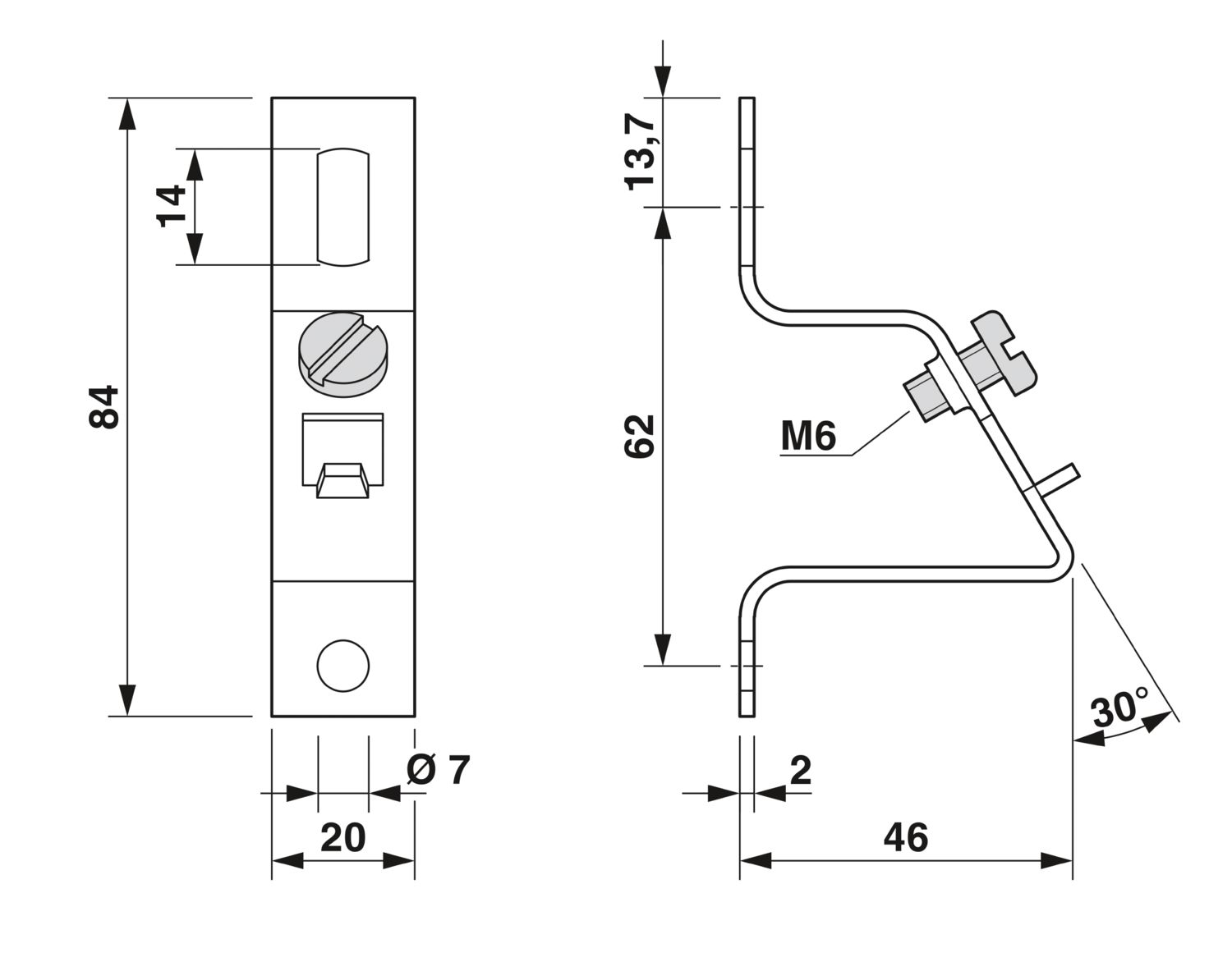 Arco diagonal com parafuso M6, encosto para trilho de fixação, fixação dos trilhos de fixação em ângulo de inclinação de 30°, altura: 46 mm