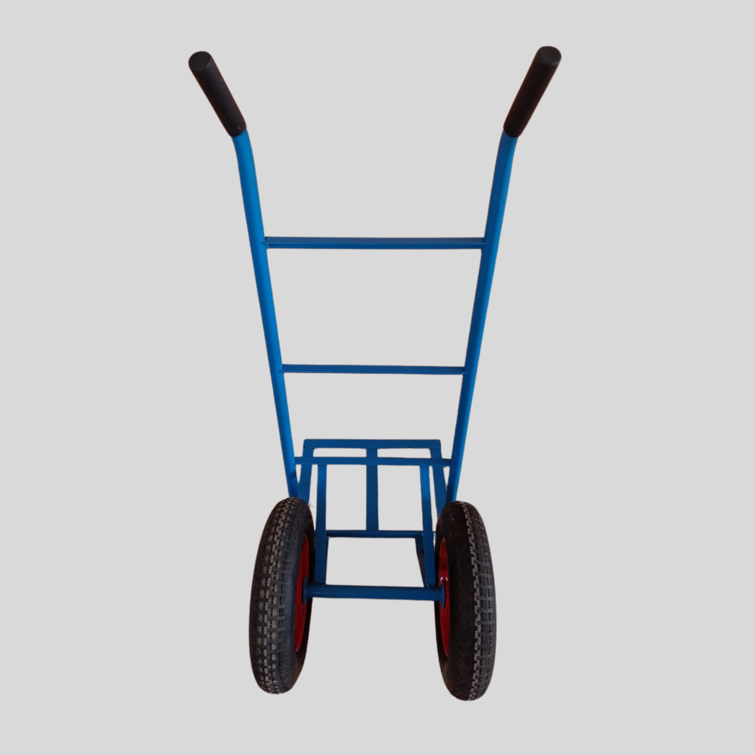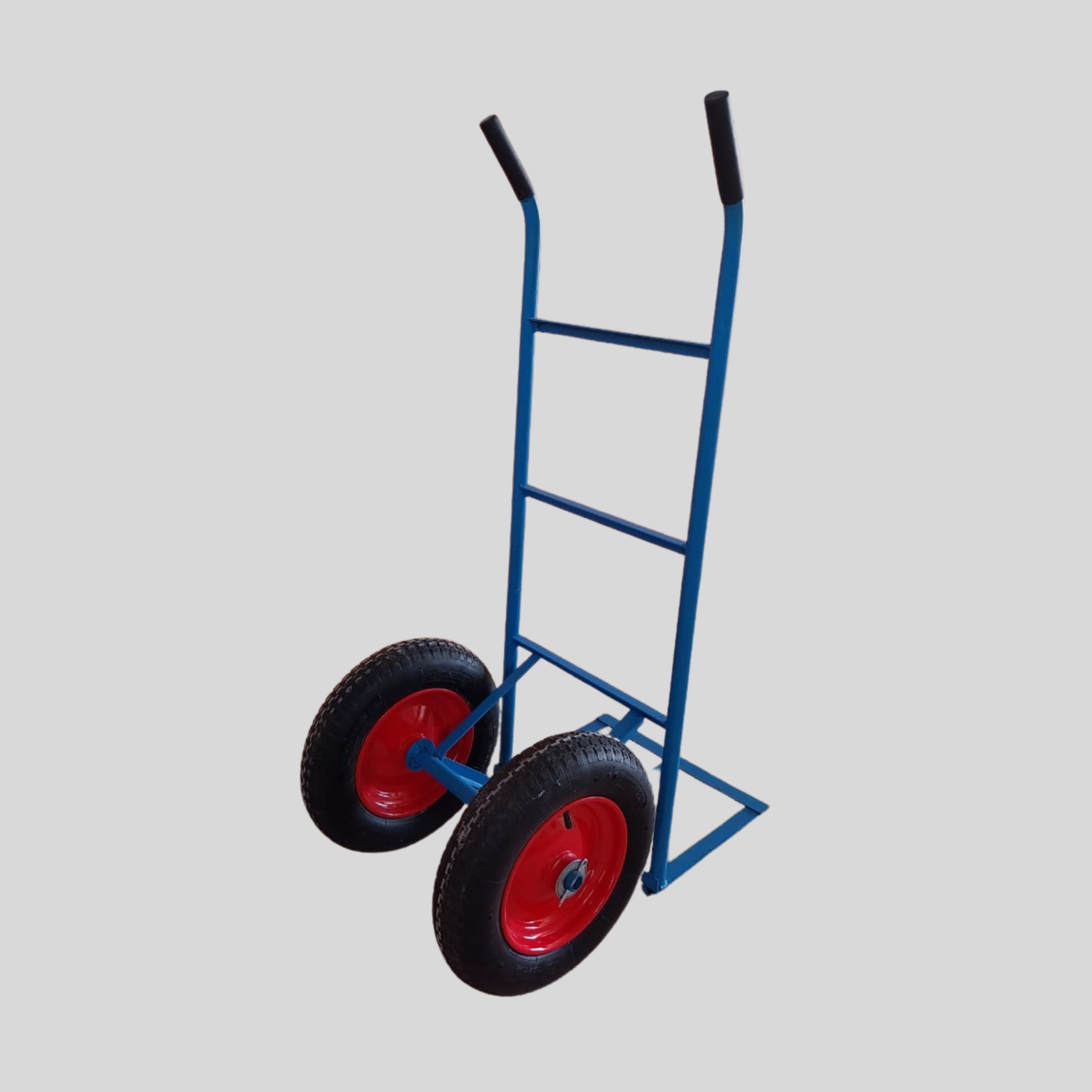 O carrinho conta com rodas de ferro de 28” c/ furo de 25mm e pneus 4 lonas com câmaras, equipados com dois rolamentos ZZ em cada roda, assegurando movimentação suave, estabilidade e menor esforço operacional. O acabamento em azul del rei e vermelho reforça a identidade industrial e melhora a visibilidade no ambiente de trabalho.