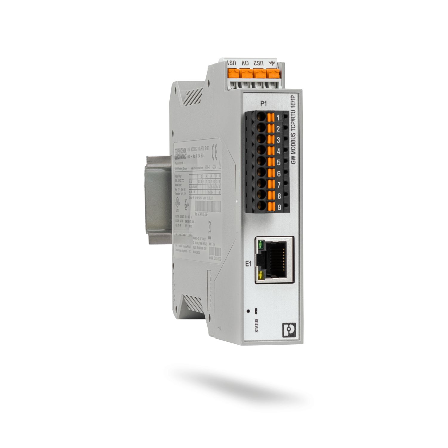 O gateway GW MODBUS TCP/RTU… converte dados seriais Modbus/RTU ou ASCII em Modbus/TCP. Suporta dispositivos cliente ou servidor. Abrange uma porta RJ45 e uma interface serial.