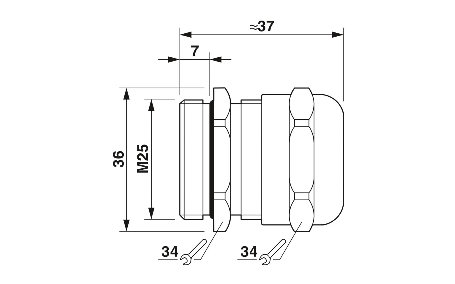 Conexão metálica até 5 bar, comprimento de rosca: 7 mm, diâmetro de cabo: 14 – 21 mm, SW 34, conexão: M25