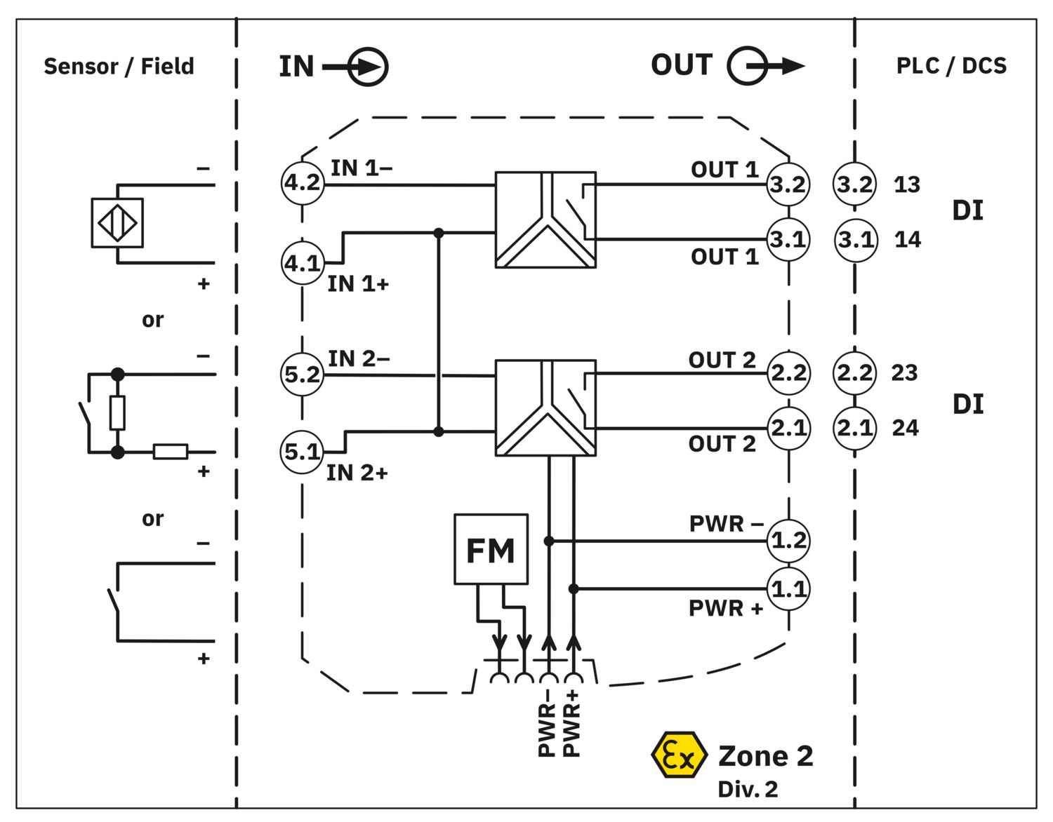 Amplificador condicionador de sinal NAMUR, 2 canais para operação de sensores de proximidade e interruptores. Os sinais são transmitidos através de saídas de relé (contato normalmente aberto) para o nível de comando. Reconhecimento de erros de linha, isolamento galvânico de 3 vias, SIL 2, conexão push-in.
