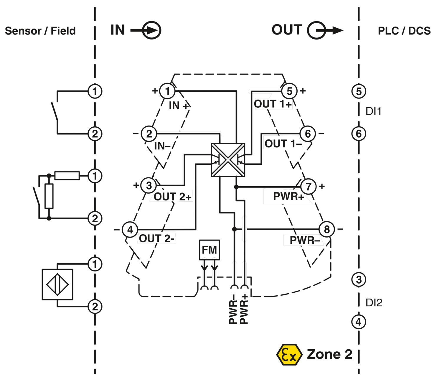 Amplificador condicionador de sinal NAMUR configurável com sistema de conexão plugável para sensores de proximidade, contatos de comutação livres de potencial e com resistores. 2 saídas de transistor, configuráveis através de chave DIP. Sistema de conexão a parafuso.