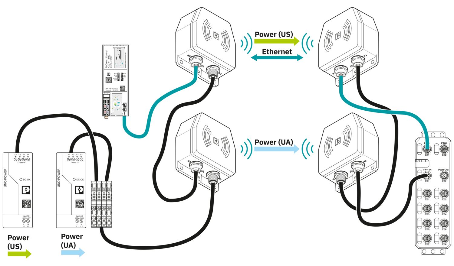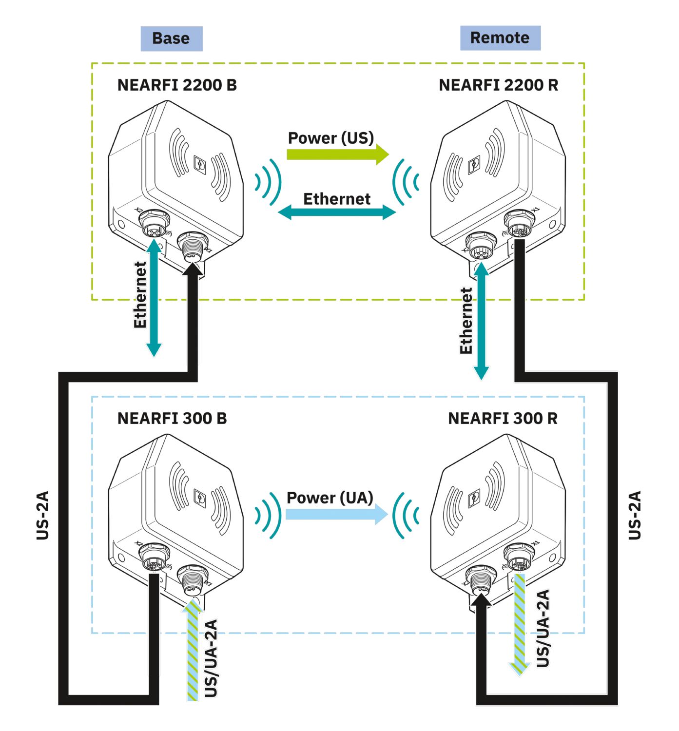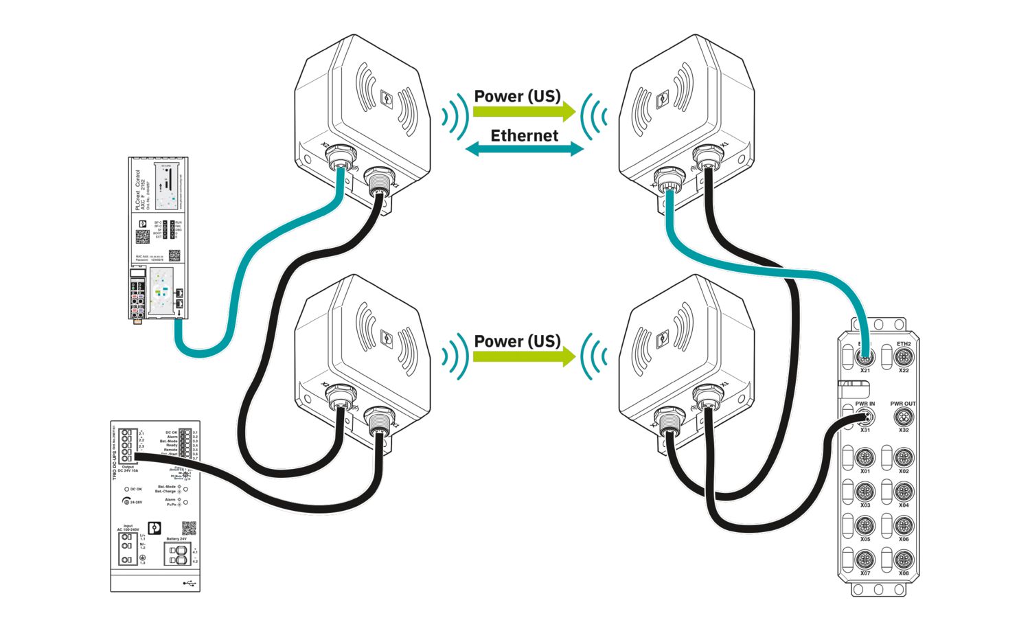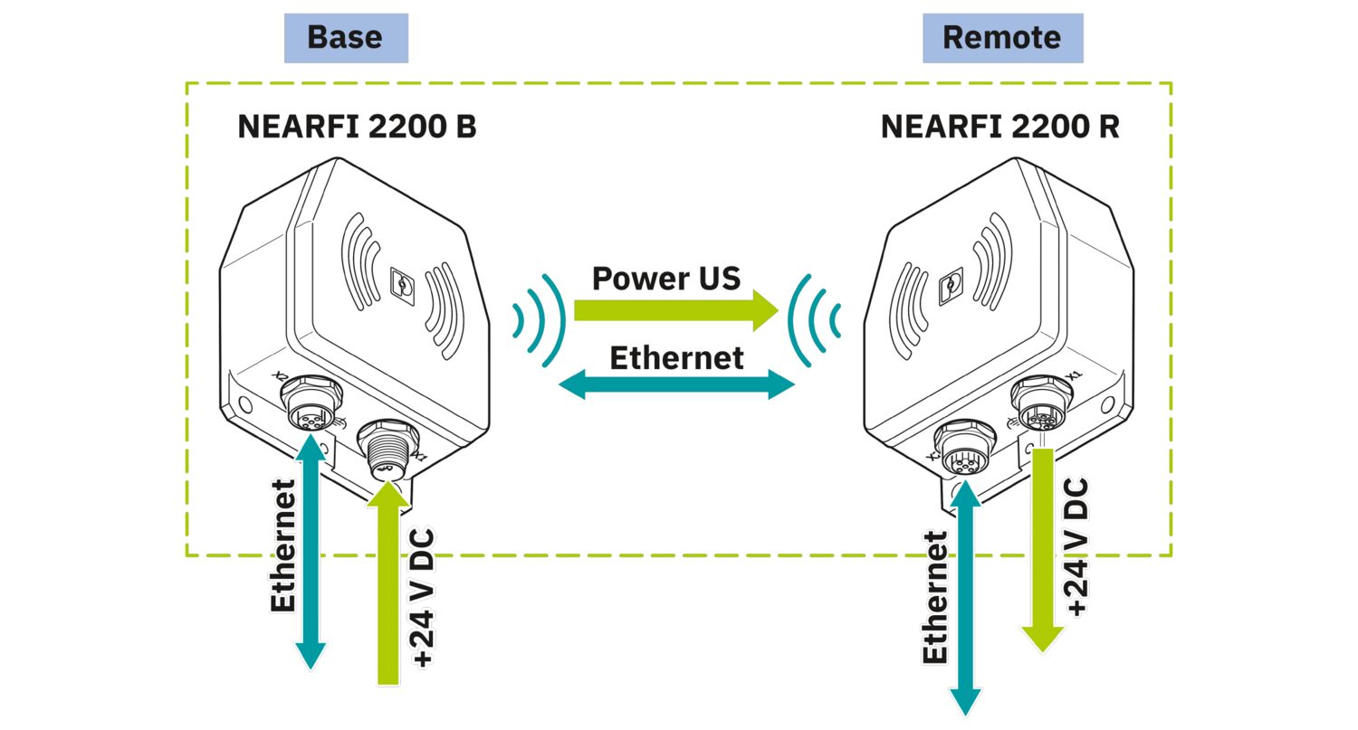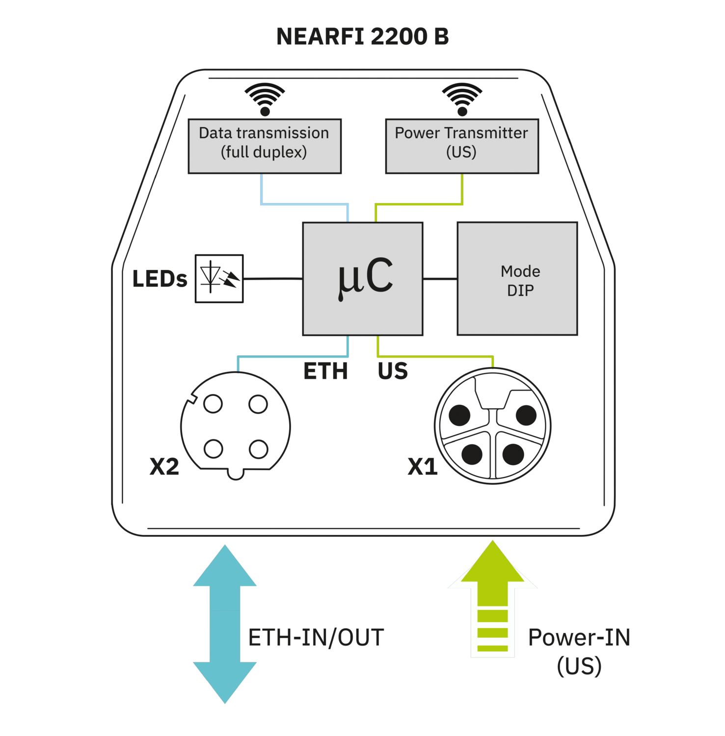 NearFi-Base, acoplador de energia sem contato e Ethernet em tempo real, 50 W (US), 100 MBit/s, alcance ≤10 mm, M12 PUSH-PULL, IP65, pode ser combinado com o NEARFI 2200 R. Opcional: 100 W (US) em combinação com o NEARFI 200 ou 2 x 50 W (US+UA) com o NEARFI 300