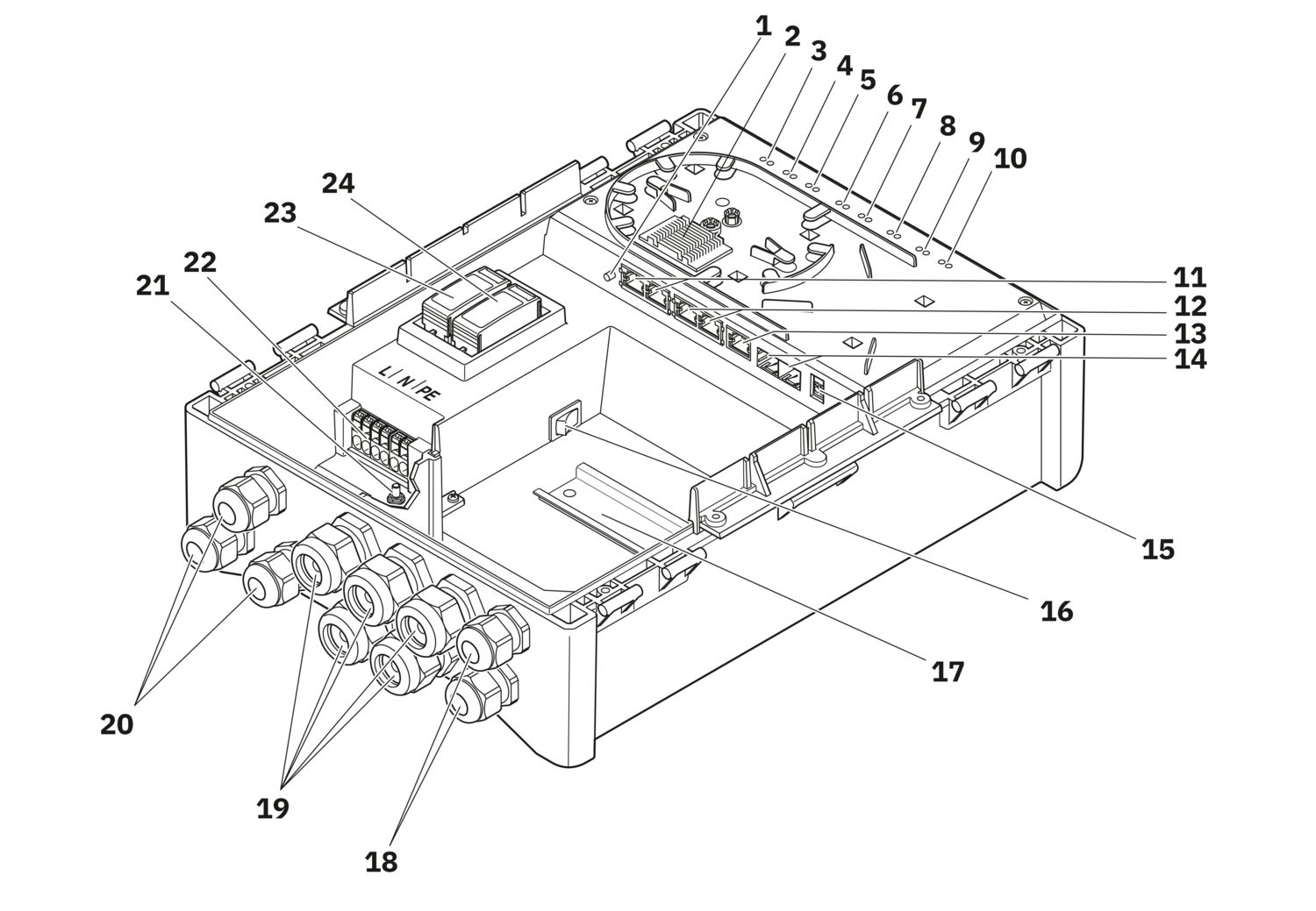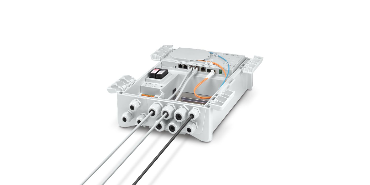 Smart Ethernet Box para conexão de dispositivos finais PoE, quatro portas PoE, duas portas Uplink (slots SFP), Switch Gerenciável, proteção contra surto e gaveta de junção integradas, tensão de alimentação 100 … 240 V AC, montagem em parede ou mastro