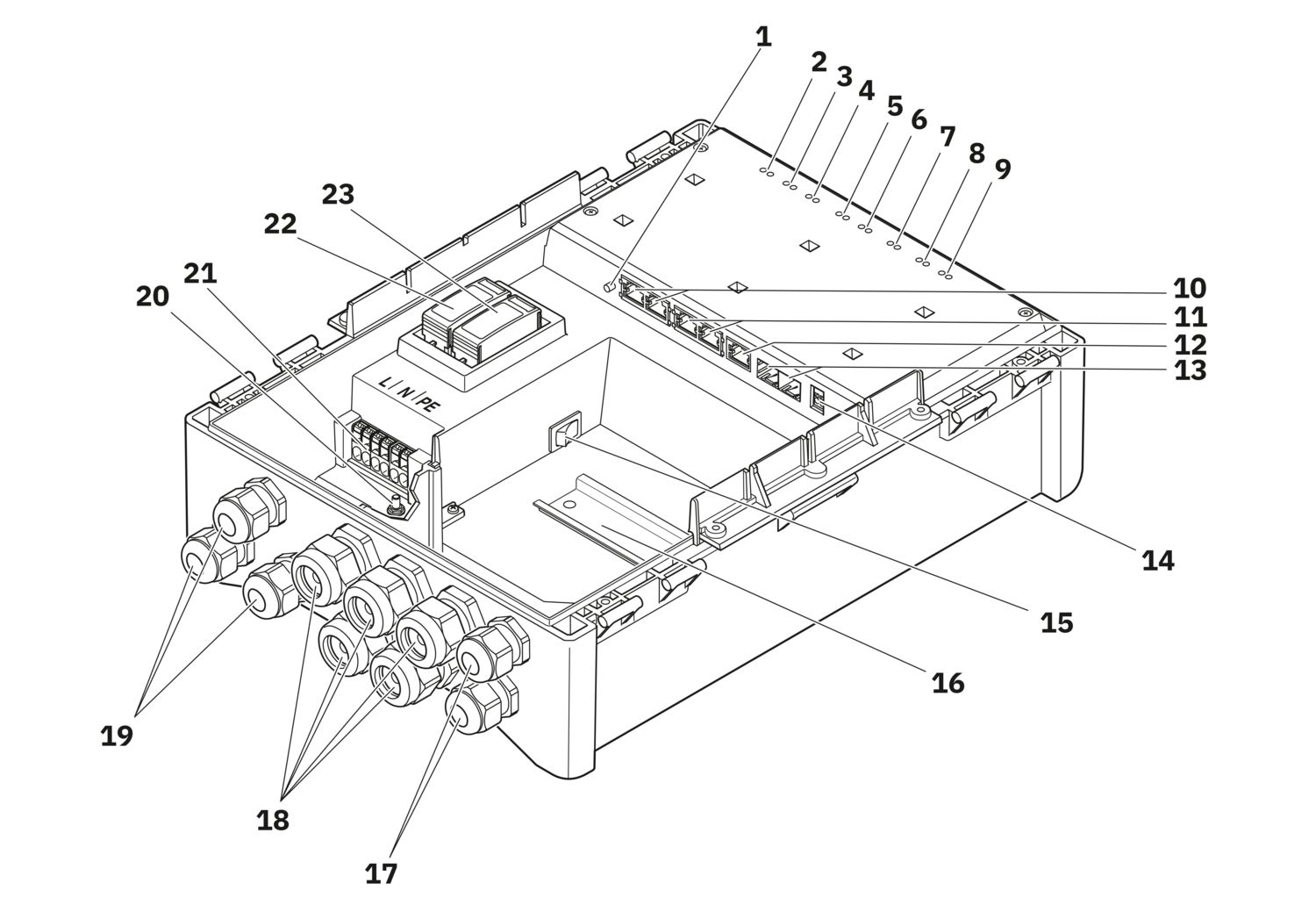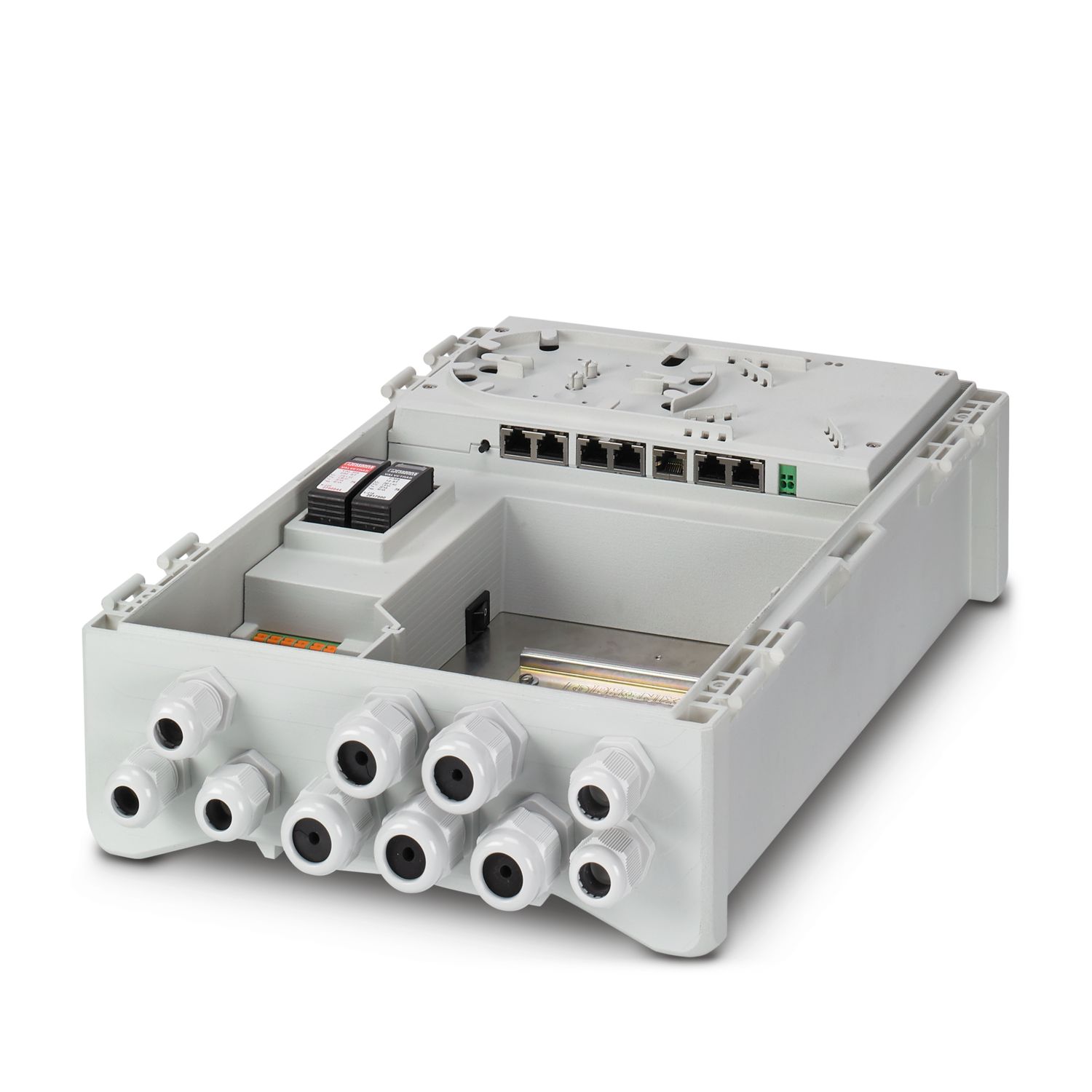 Smart Ethernet Box para conexão de dispositivos finais PoE, quatro portas PoE, duas portas Uplink (RJ45), Switch Gerenciável e proteção contra surto integrada, tensão de alimentação 100 … 240 V AC, montagem em parede ou mastro