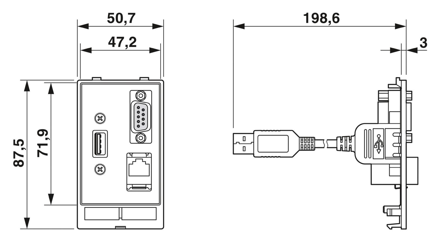 Placa frontal de dados com insertos de contato, plástico com chapa de blindagem, 1 USB (soquete/soquete/cabo de 0,7 m) formato A; 1 D-SUB 9 (soquete/pino); 1 RJ45, 8 polos, metal, CAT5e (soquete/soquete)