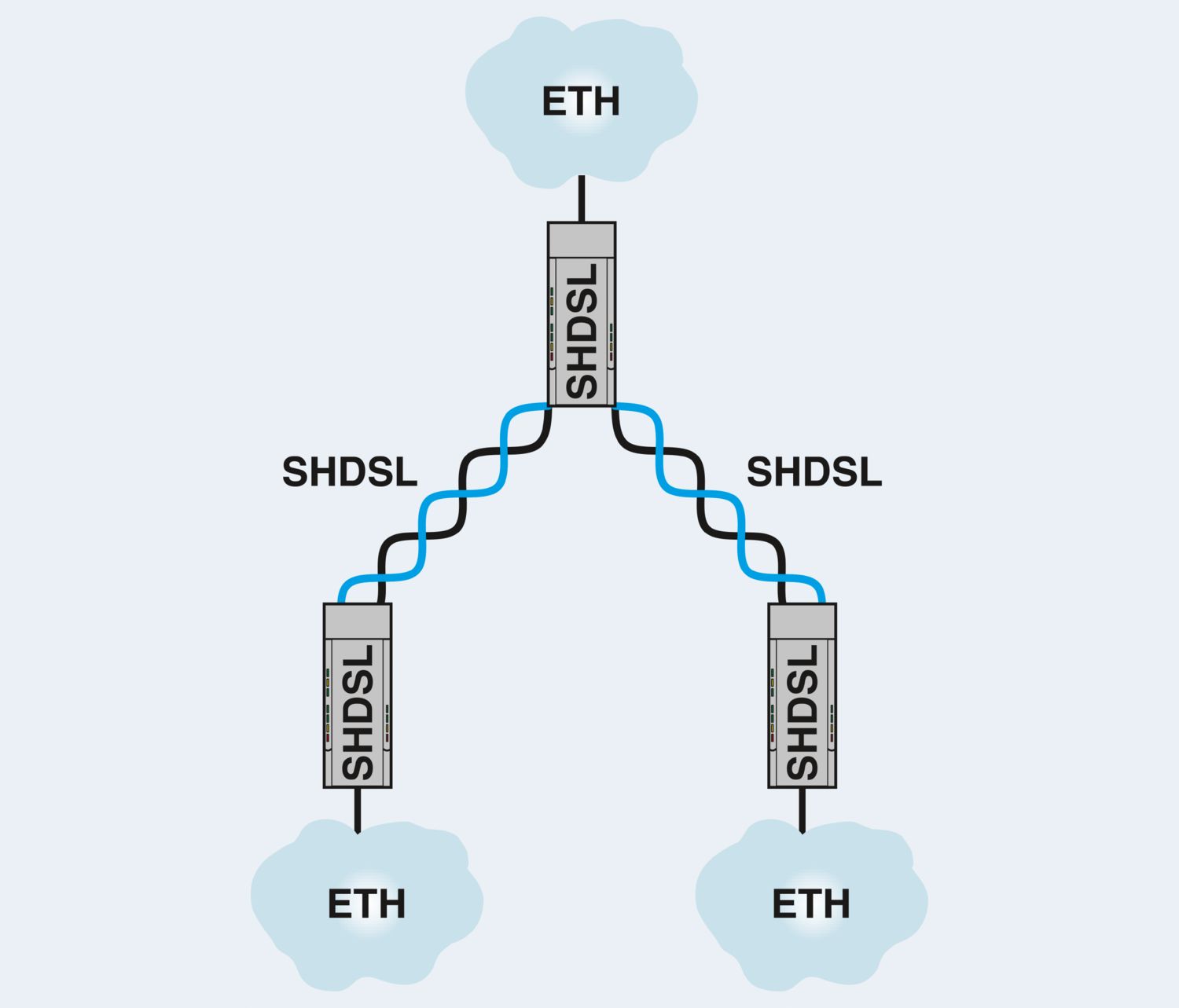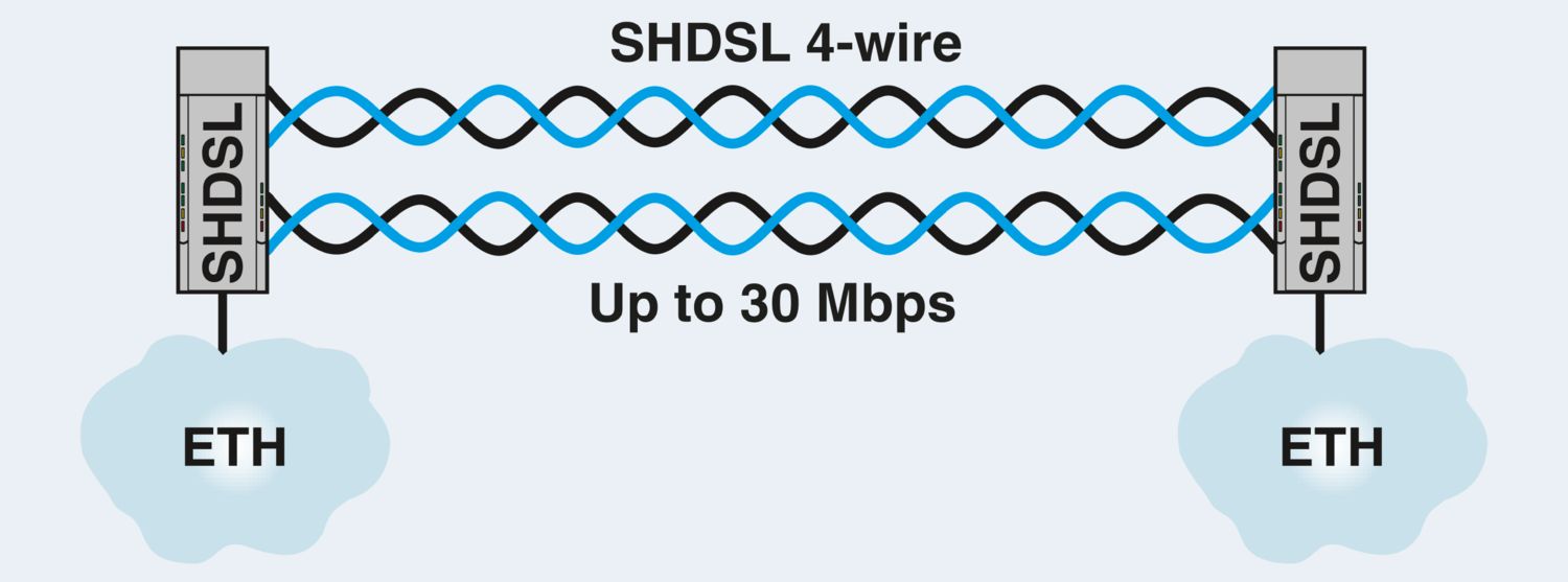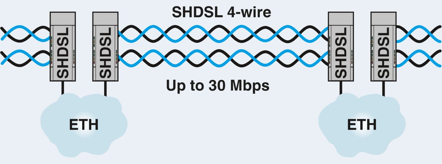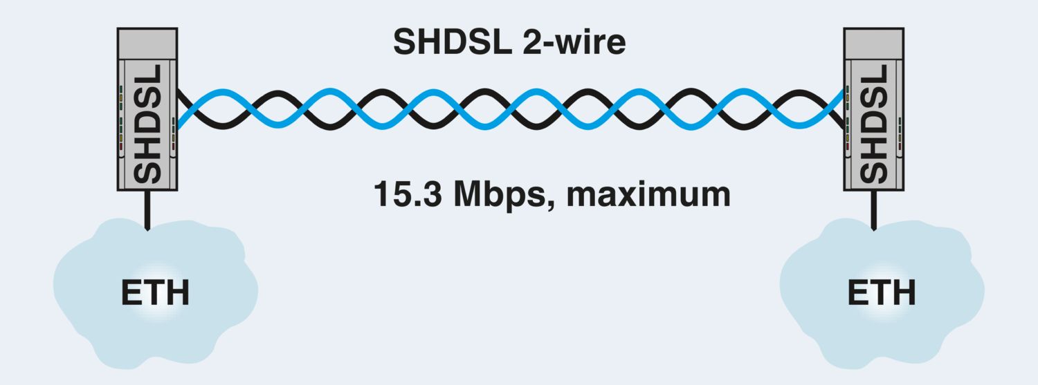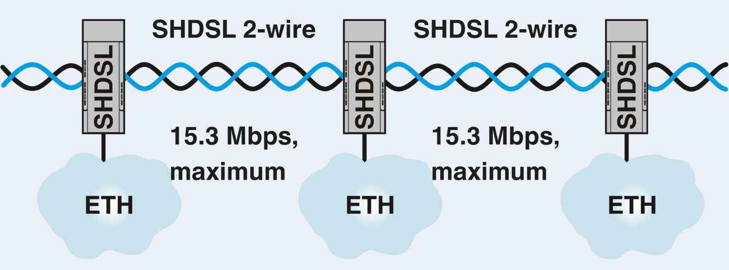 Segunda geração: extensor Ethernet não gerenciável para conexões ponto a ponto, em linha e circulares, taxas de transmissão de dados até 30 MBit/s, distâncias até 20 km por cabos de cobre próprios da empresa, diagnóstico via USB e LEDs, 2 portas SHDSL, 1 porta LAN
