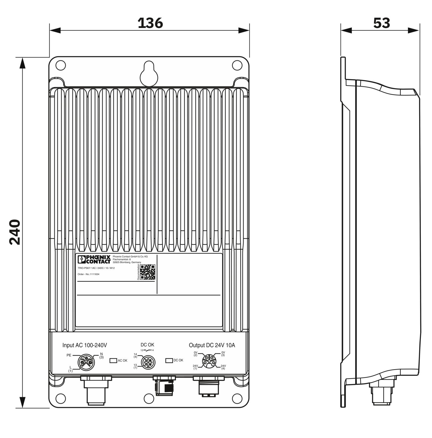 Fonte de alimentação com ciclo primário TRIO POWER, Conector de encaixe redondo M12, Montagem na parede, entrada: 1 fásico, saída: 24 V DC / 10 A