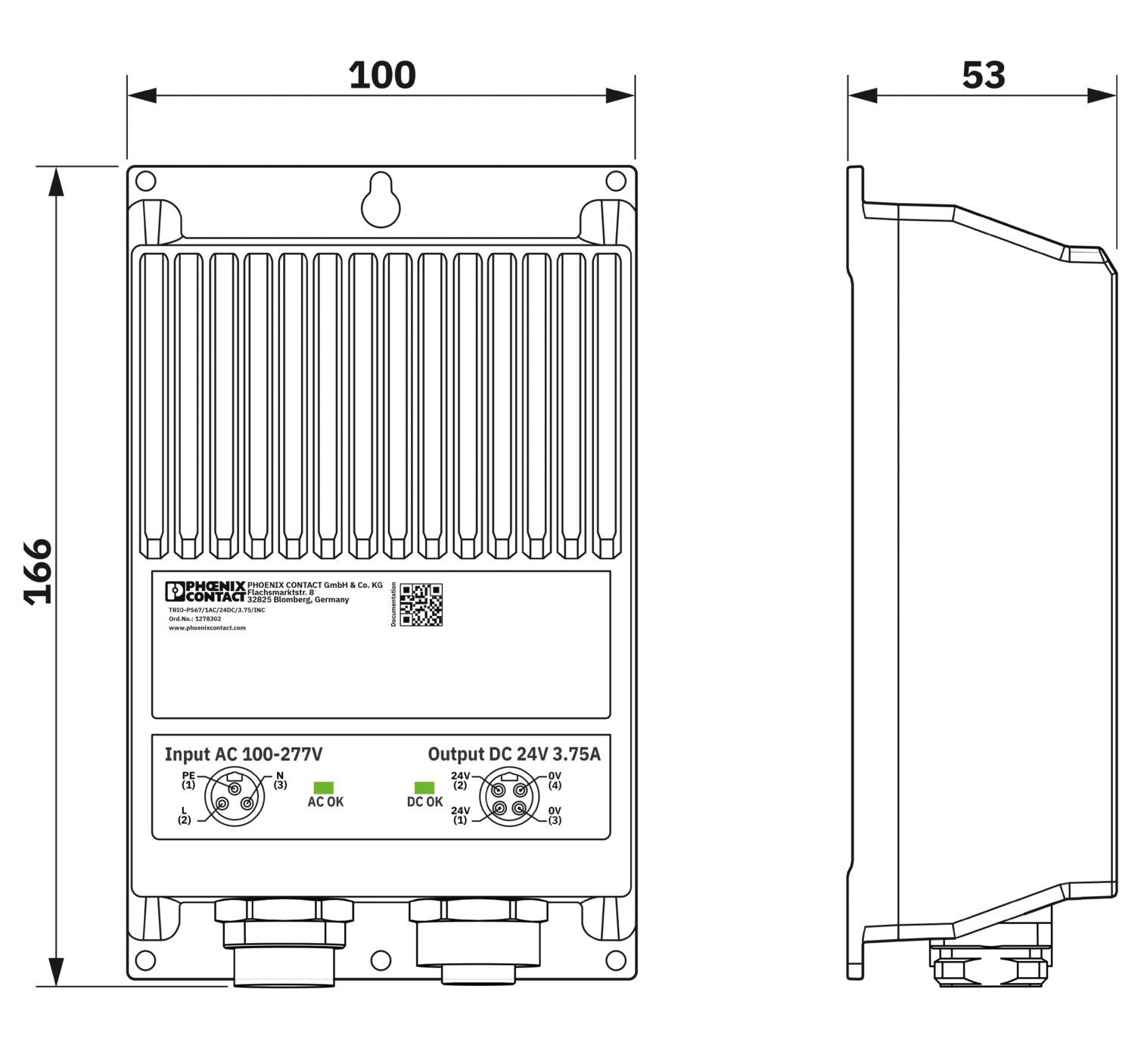 Fonte de alimentação com ciclo primário TRIO POWER, Conectores de encaixe circulares de 7/8″, Montagem na parede, entrada: 1 fásico, saída: 24 V DC / 3,75 A