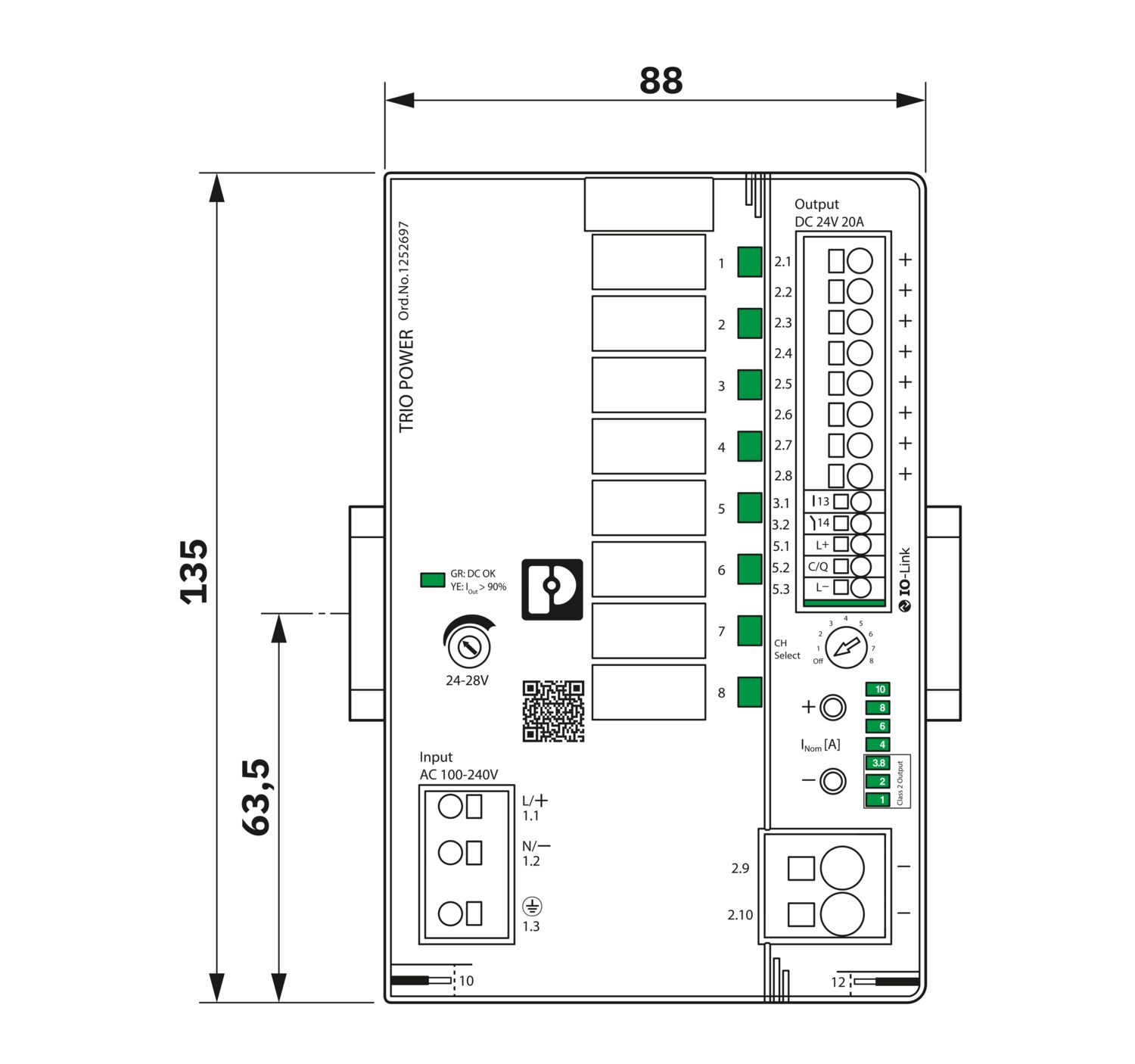 Fonte de alimentação com ciclo primário, TRIO POWER, Conexão Push-in, Disjuntor eletrônico de proteção de 8 canais, IO-Link, Montagem em trilho de fixação, entrada: 1 fásico, saída: 24 V DC / 20 A, ajustável de 24 V DC … 28 V DC