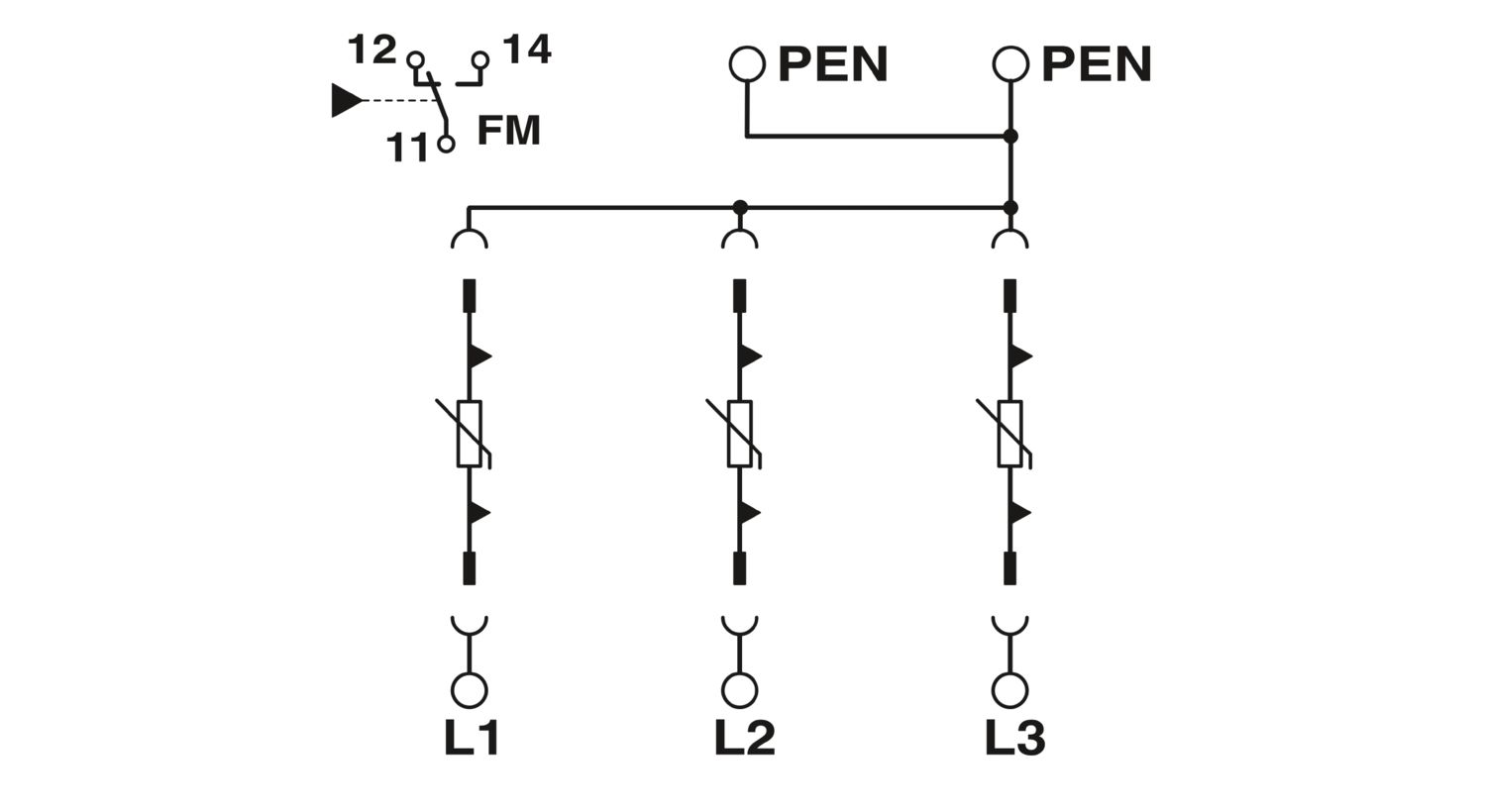 Protetor contra surtos de tensão plugável, conforme tipo 2/classe II, para redes de fornecimento de energia trifásicas com PE e N combinados em um condutor (sistema de 4 condutores: L1, L2, L3, PEN), com contato de sinalização remota.