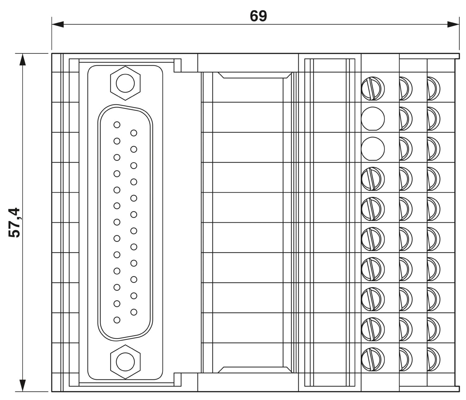 Módulo VARIOFACE, com conexão a parafuso e conector macho D-SUB miniatura, para montagem sobre trilhos de fixação NS 35, número de pólos: 25